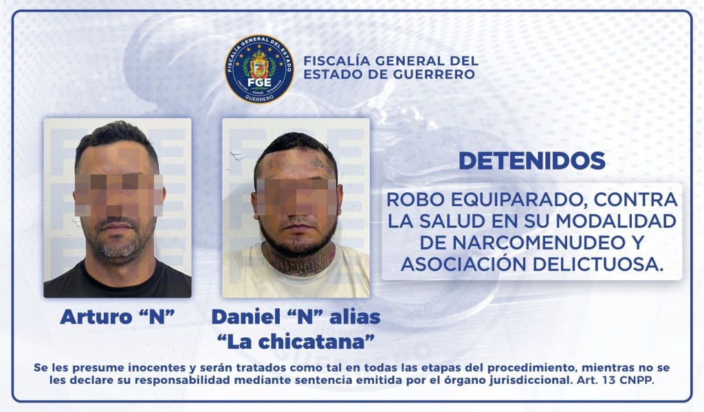 Chilpancingo, Gro. 08 de agosto de 2024.- En operativos interinstitucionales realizados en el municipio de Teloloapan, la Fiscalía General del Estado de Guerrero (FGE Guerrero), en coordinación con el Ejército Mexicano, Guardia Nacional y Policía del Estado, logró la detención de Arturo “N” y Daniel “N”, alias “La Chicatana”, identificados como dos presuntos generadores de violencia en la región Norte del estado.