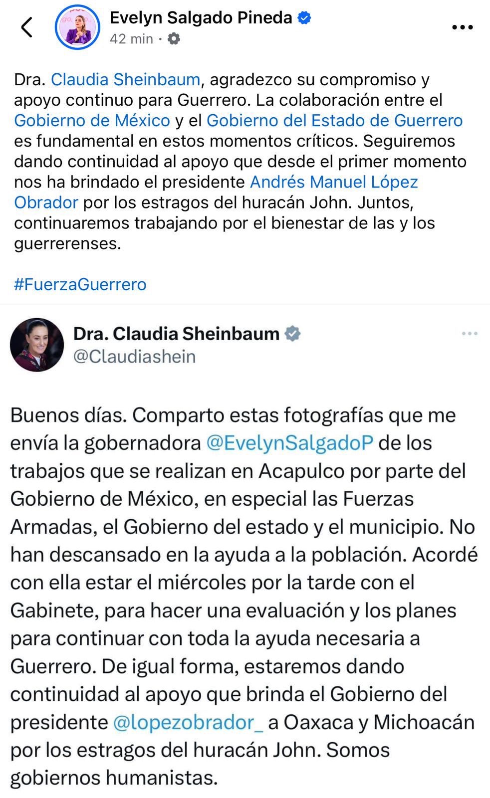 «Seguiremos dando continuidad al apoyo que desde el primer momento nos ha brindado el presidente Andrés Manuel López Obrador por los estragos del huracán «John». Juntos, continuaremos trabajando por el bienestar de las y los guerrerenses», expresó Evelyn Salgado Pineda a la Dra. Claudia Sheinbaum.