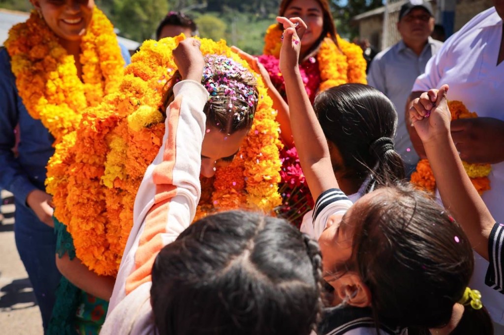 Con música de viento y porras los pobladores de Ayahualtempa recibieron a la gobernadora con collares de flores, en un ambiente de alegría, al ser la primera mandataria en visitar esta comunidad, donde reiteró su compromiso de mejorar las condiciones de bienestar y transformar la vida de los habitantes, especialmente de las y los niños, quienes en enero pasado fueron presentados con armas.
