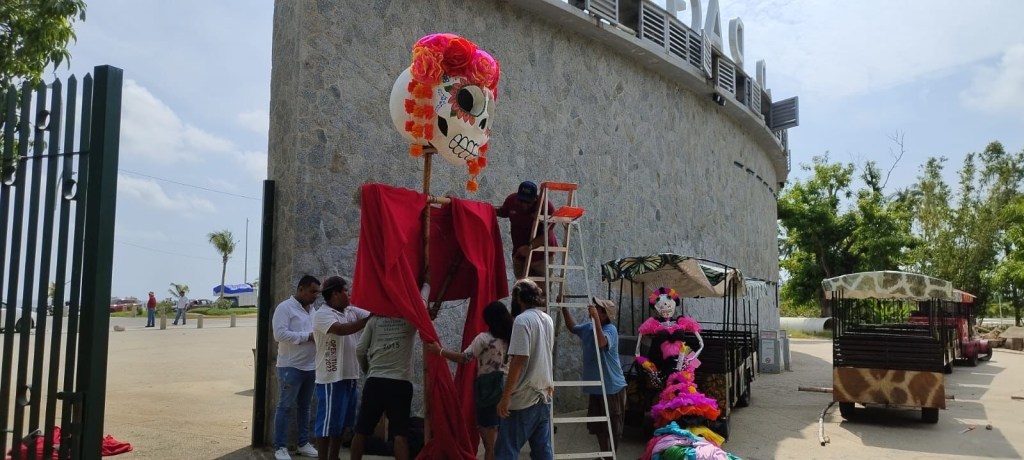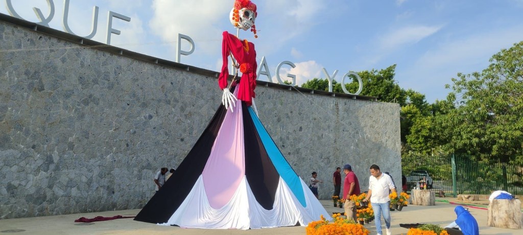 Acapulco, Gro., 01 de noviembre de 2024.- Como parte de las tradiciones mexicanas que recuerdan a quienes ya partieron de este mundo, el Parque Papagayo colocó en la explanada principal una Catrina gigante como ofrenda monumental de este centro recreativo, en el marco de las festividades por el Día de Muertos.
