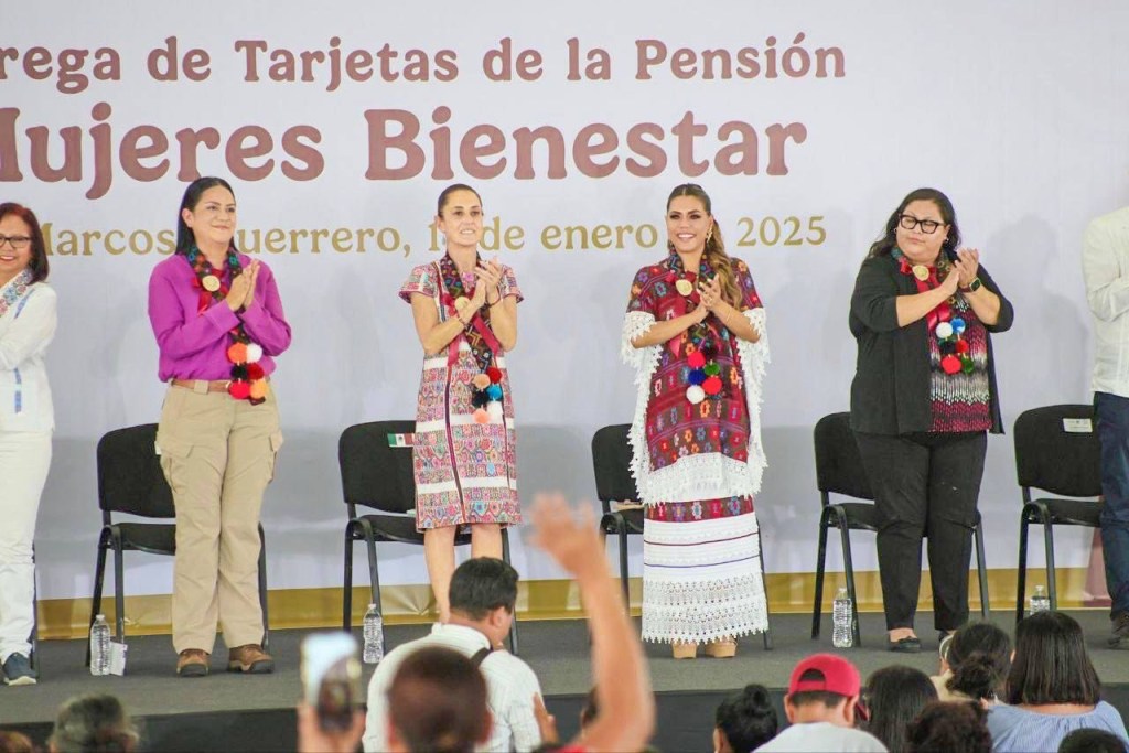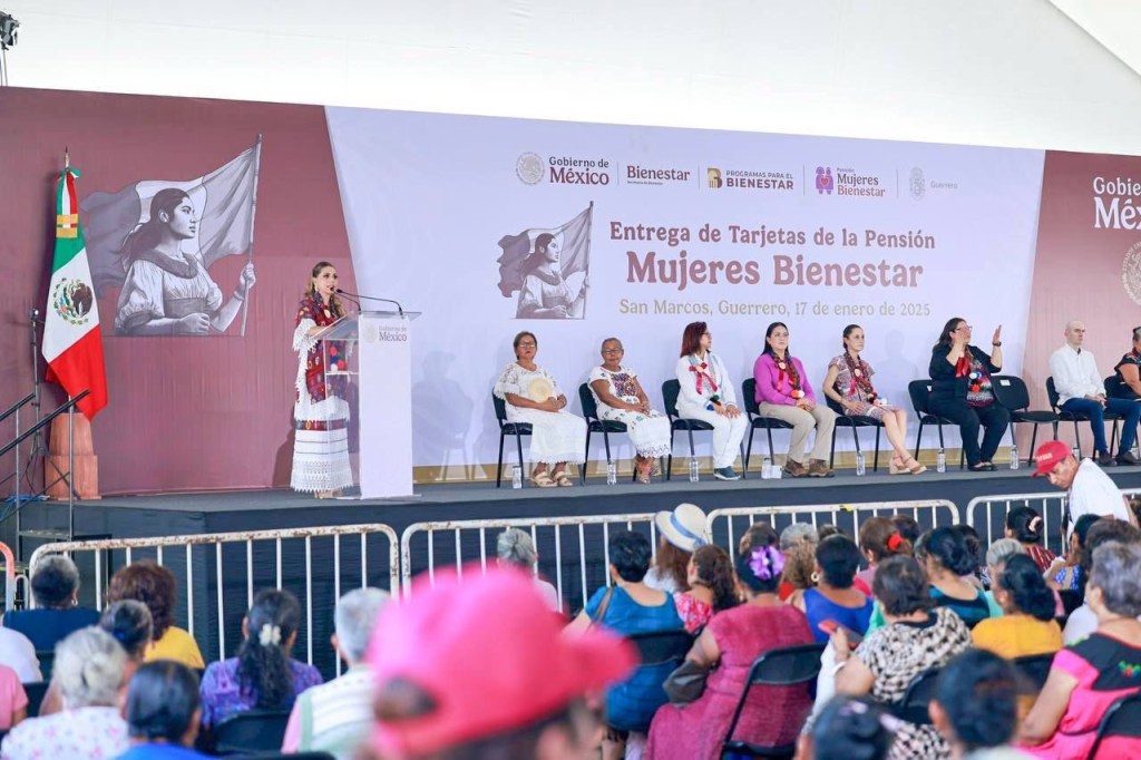 San Marcos, Gro., 17 de enero de 2025.- La gobernadora Evelyn Salgado Pineda acompañó a la presidenta de México, Claudia Sheinbaum Pardo en el evento de Entrega de tarjetas de la pensión Mujeres Bienestar, un acto que se traduce en el reconocimiento a la labor de las mujeres, quienes día a día, ponen todo su esfuerzo para contribuir al fortalecimiento del país. Se informó que con este programa se beneficiará a 28 mil mujeres guerrerenses, con una pensión bimestral de 3 mil pesos.