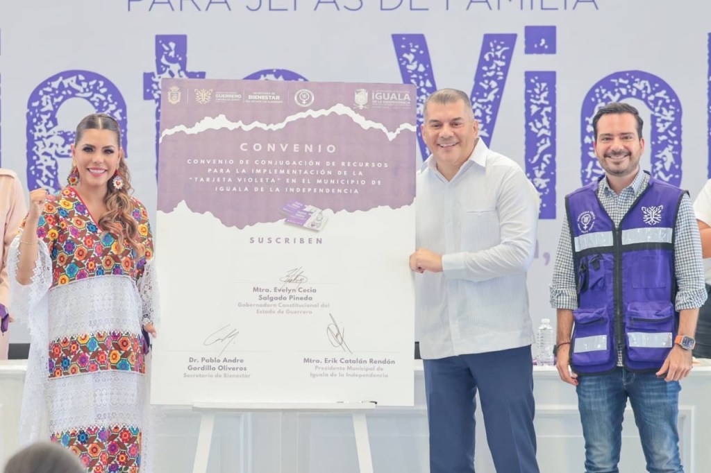 La gobernadora Evelyn Salgado acompañada por el senador Félix Salgado Macedonio y la presidenta del Sistema DIF Guerrero, Liz Salgado Pineda, junto con el titular de Bienestar, Pablo Gordillo y el alcalde de Iguala, Erik Catalán Rendón, se entregaron de forma simbólica las tarjetas Violeta a las beneficiarias.