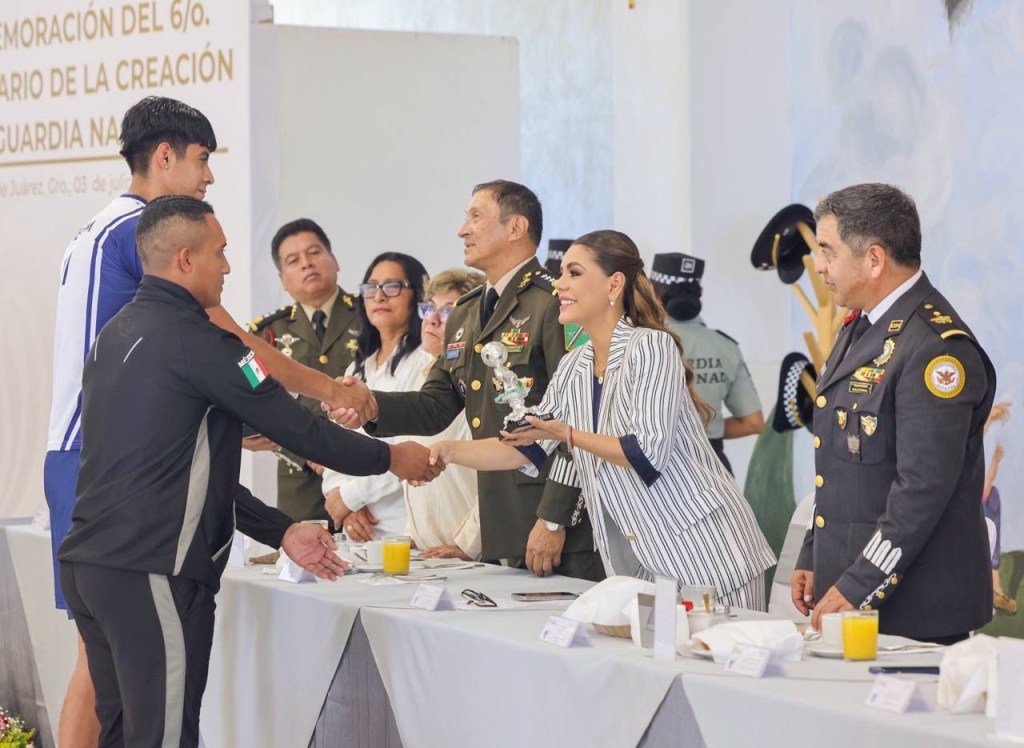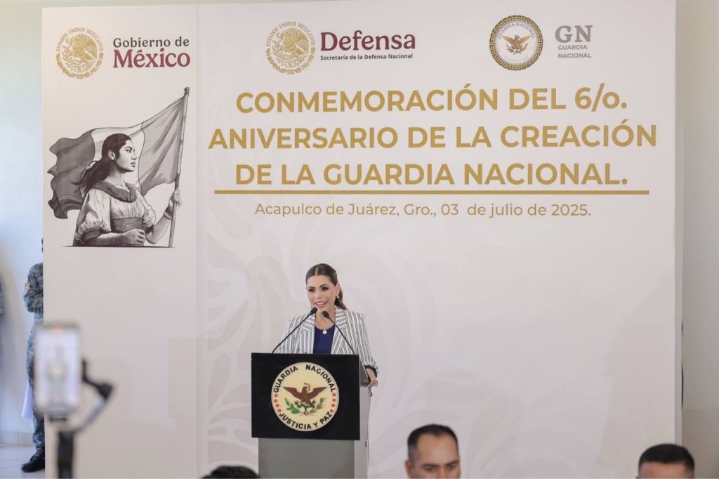 Acapulco, Gro., 3 de julio de 2025.- “Hoy más que nunca, Guerrero reconoce a la Guardia Nacional; la reconoce como una fuerza viva de cambio, como una realidad con uniforme, con botas, con manos, pero sobre todo, con mucho corazón en el territorio. Son ustedes la transformación, que no queda en promesas, la que se juega el cuerpo por hacer Patria”, expresó la gobernadora Evelyn Salgado Pineda, durante la Ceremonia de Conmemoración del Sexto Aniversario de la Creación de la Guardia Nacional, en donde también agradeció todo el trabajo y coordinación a favor de la población en materia de seguridad, proximidad social y apoyo en casos de desastres.