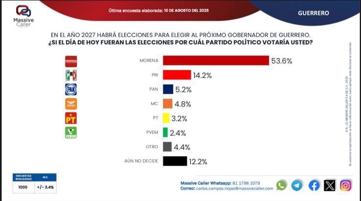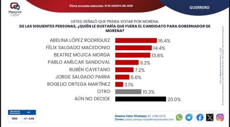 La encuesta más reciente de Massive Caller la coloca en la cima de las preferencias internas con 16.4%, superando a pesos pesados del partido como Félix Salgado Macedonio (14.4%) y Beatriz Mojica Morga (13.8%). Esto demuestra que su liderazgo no es circunstancial, sino el resultado de una estrategia política efectiva y una gestión que conecta con la gente.