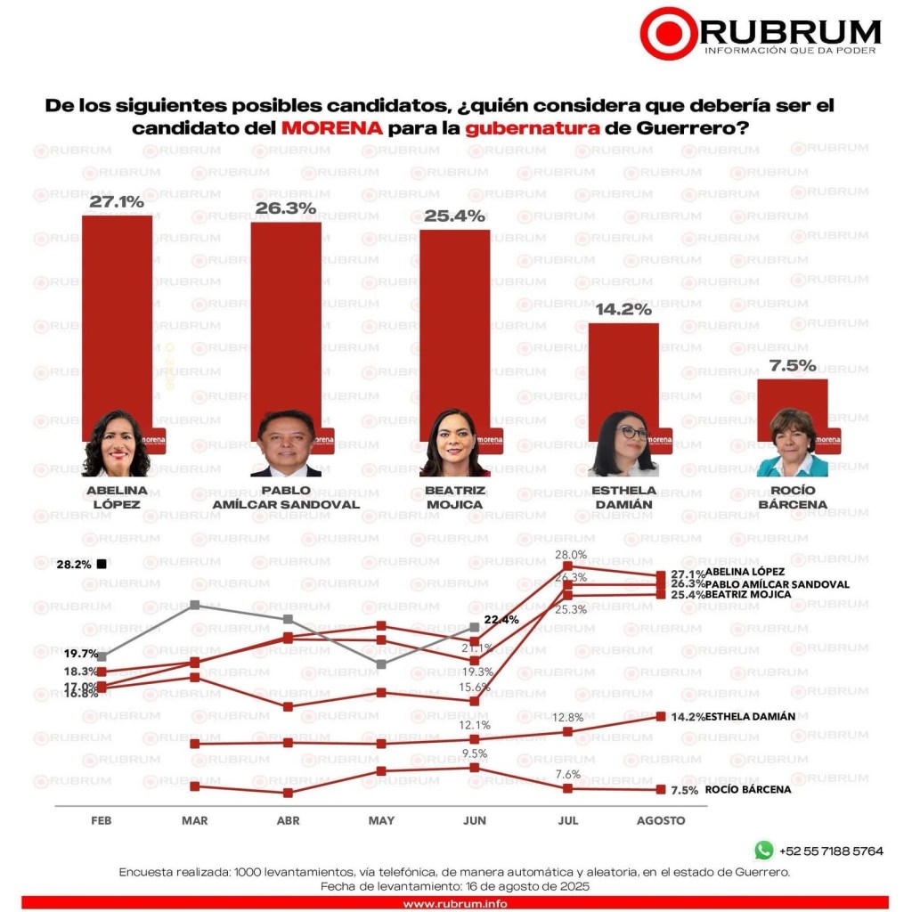 La encuesta más reciente de Rubrum, levantada el 16 de agosto, confirma que la alcaldesa de Acapulco encabeza la interna de Morena con 27.1%, seguida de cerca por Pablo Amílcar Sandoval (26.3%) y Beatriz Mojica (25.4%), mientras Esthela Damián (14.2%) y Rocío Bárcena (7.5%) se rezagan.