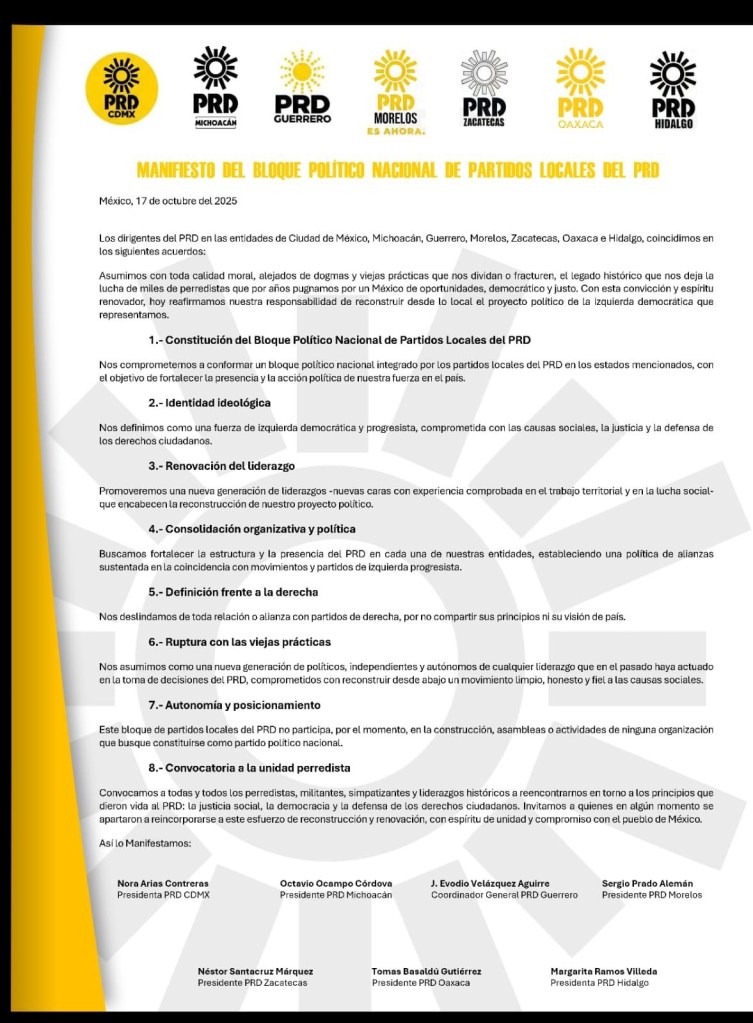 “Nos reivindicamos con nuestra historia en la izquierda. Asumimos con toda calidad moral el legado de miles de perredistas que lucharon por un México de oportunidades, democrático y justo. Con esa convicción reafirmamos nuestra responsabilidad de reconstruir desde lo local el proyecto político de la izquierda democrática”, establece el documento firmado por los dirigentes estatales.