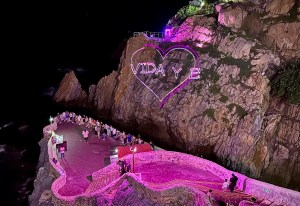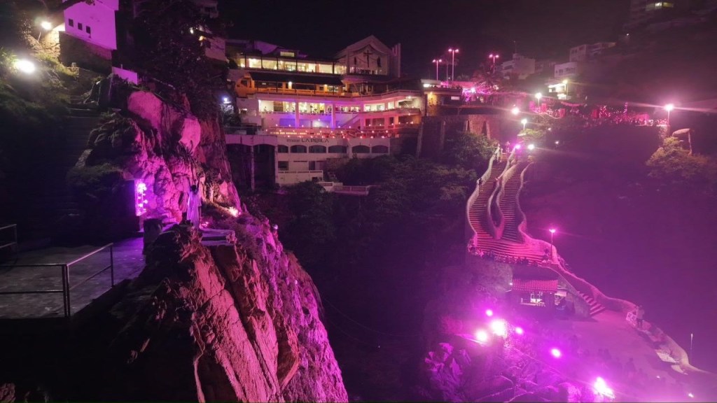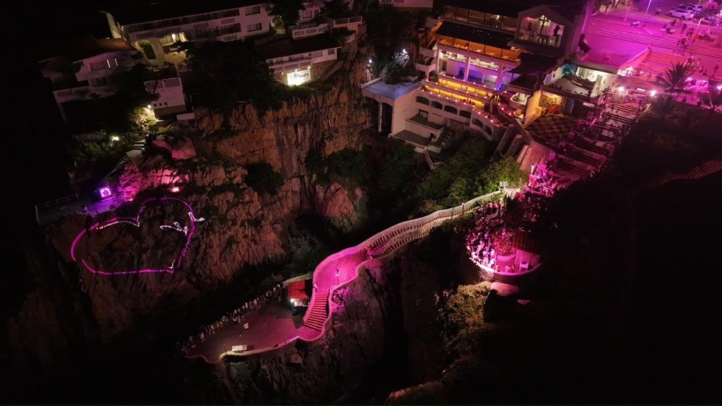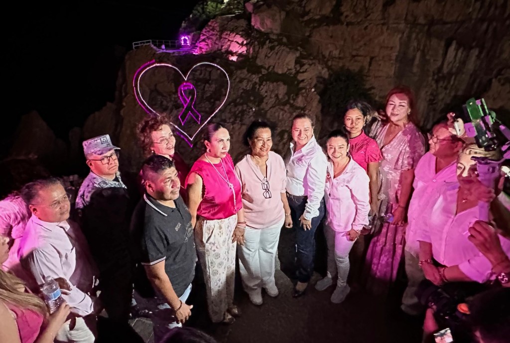 Acapulco, Gro., 16 de octubre de 2025.- Con un mensaje de esperanza y prevención, la presidenta municipal Abelina López Rodríguez iluminó de rosa los acantilados de La Quebrada, como parte de las actividades del Día Mundial de la Lucha contra el Cáncer de Mama, que se conmemora cada 19 de octubre.