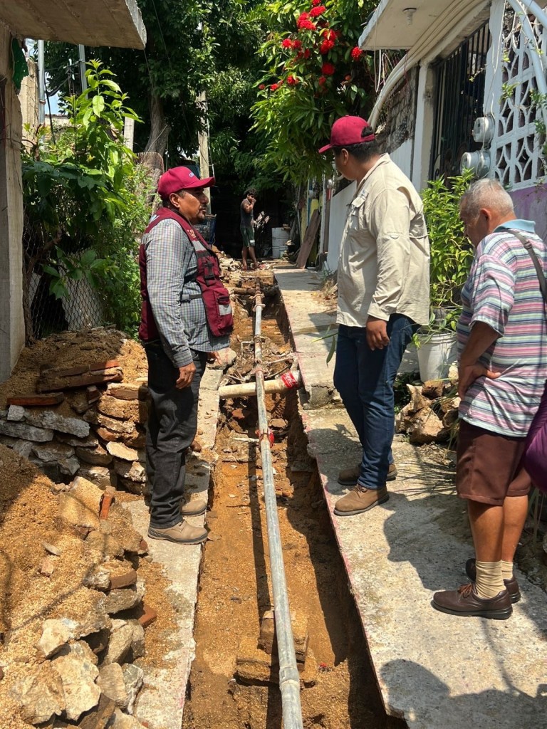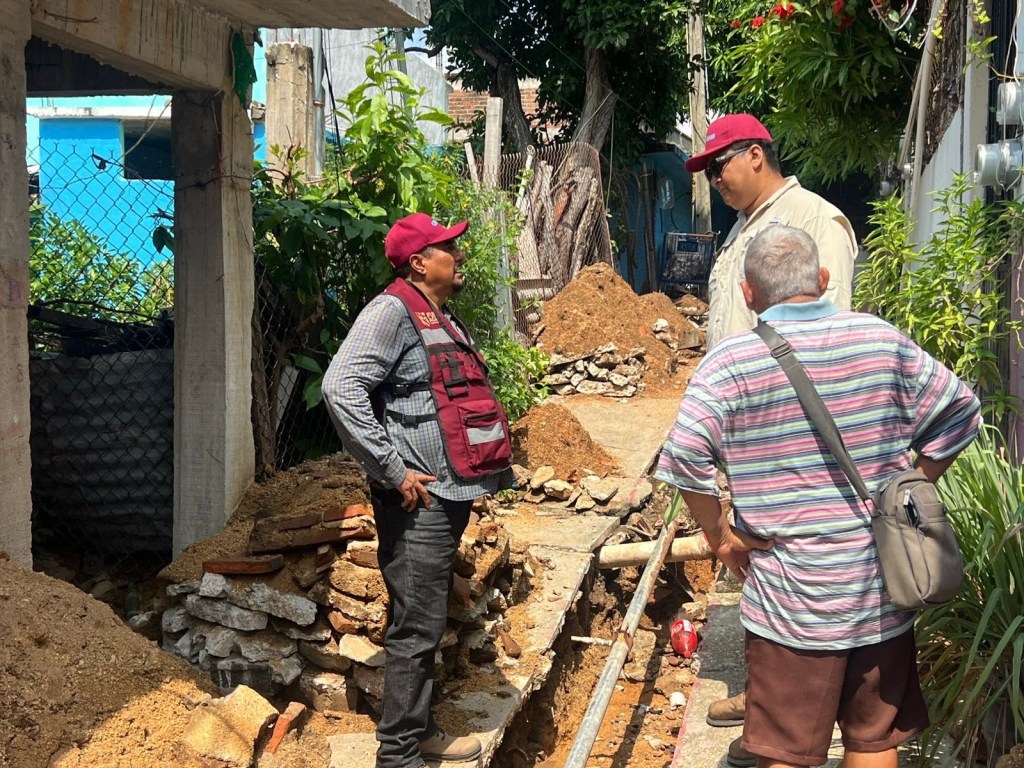 Durante la visita, acompañado del director operativo Gustavo Radilla Callado, se revisó la calle Q del Nuevo Centro de Población, donde se identificaron fugas de agua y se reemplazan tuberías, intervenciones que buscan que los vecinos dispongan de un suministro confiable y continuo.