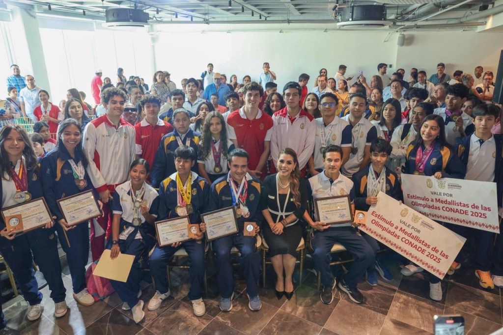 Acapulco, Gro., 19 de diciembre del 2025.- “Hoy reconocemos lo mejor del deporte guerrerense, entregamos estas medallas, las medallas del premio estatal del deporte 2025, y se otorga un estímulo a todas nuestras y nuestros medallistas que representaron a Guerrero en la Olimpiada Nacional, los Juegos Nacionales Populares, los Juegos Nacionales Indígenas y la Paraolimpiada 2024 y 2025”, señaló la gobernadora Evelyn Salgado, durante la entrega del Premio Estatal del Deporte 2025 y estímulos a medallistas que participaron en los juegos CONADE 2024 y 2025.