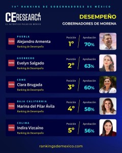 Chilpancingo, Gro.- La gobernadora guerrerense Evelyn Salgado Pineda inicia el 2026 ubicándose en el segundo lugar de la lista de los mandatarios estatales de Morena mejor evaluados en desempeño a nivel nacional de acuerdo al 70 Ranking de Gobernadores de México de CEResearch