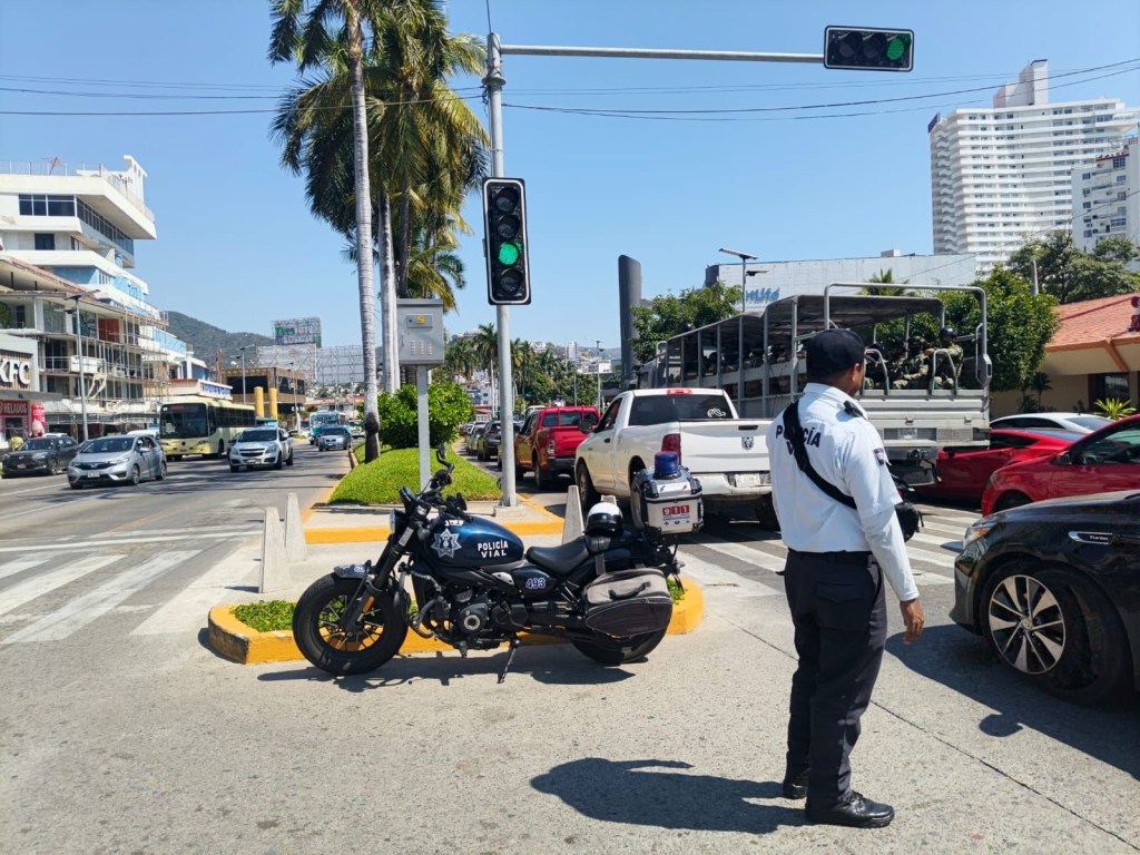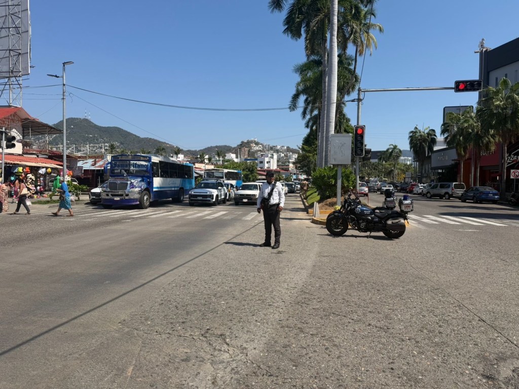 Acapulco, Gro., 10 de febrero de 2026.- La Secretaría de Seguridad Pública Municipal (SSP), a través de la Policía Vial, despliega elementos en semáforos de la avenida Costera Miguel Alemán, con cobertura en puntos de alta afluencia vehicular y peatonal como La Diana, Juan de la Cosa y Costera 125, donde se concentra gran parte de la movilidad diaria del puerto.