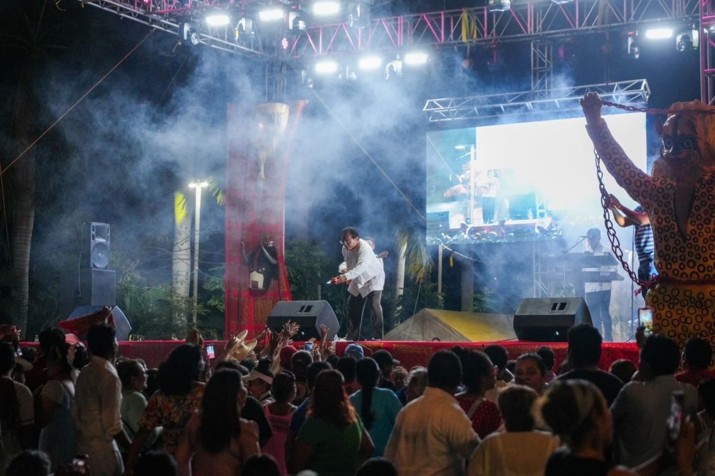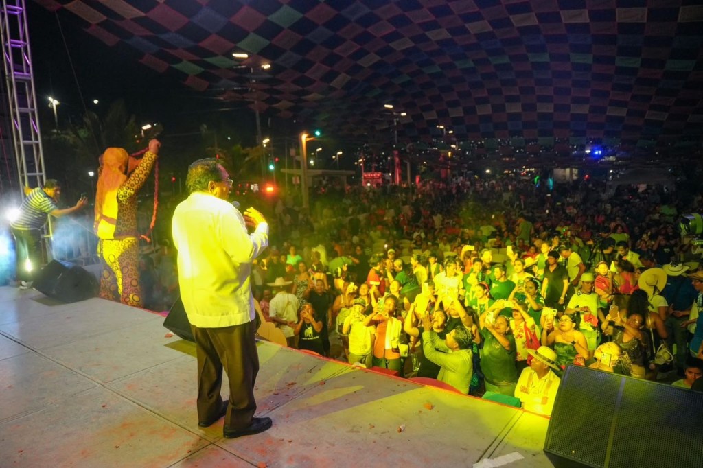 La noche alcanzó su momento más festivo con la presencia de Pepe Ramos, figura emblemática de la chilena guerrerense, quien convirtió la explanada en una pista abierta al ritmo de piezas tradicionales como El Negro Chimeco, Alingo Lingo, Pinotepa, Naila y Revolotea. Entre aplausos y palmas, residentes y visitantes se sumaron al baile colectivo que distingue a este género musical adoptado como uno de los sonidos más representativos del estado.